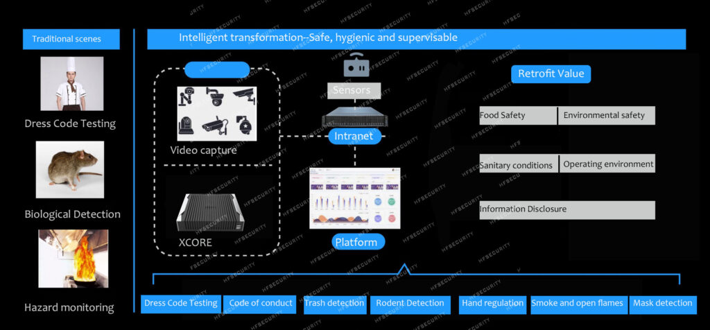 HFSECURITY bright kitchen solution can provide technical support for enterprises and consumers to make the back kitchen “transparent”, so that internal and external personnel can be “visible”, “audible” and “supervisable”. “Supervisable”; to create a safe, healthy and reliable consumer environment for the food and beverage consumer market.